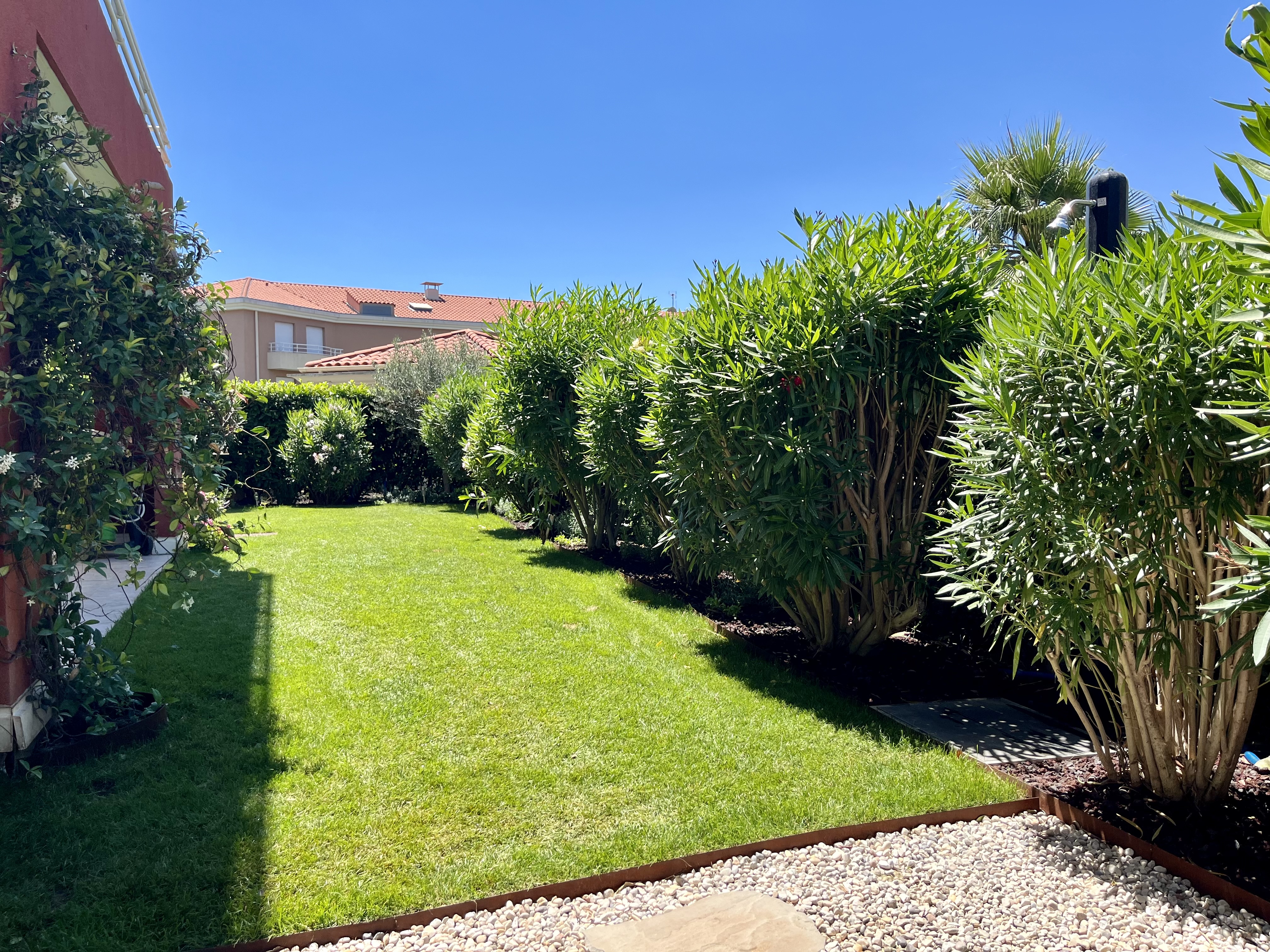 Flowers and hedges surrounds our private garden - here your kids can play safely